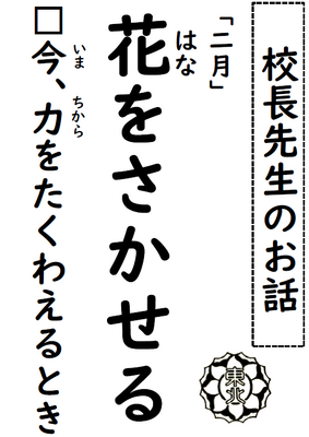 今日は、全校朝会の日です。2月の時期ということもあり、今の生活を振り返る内容としました。今回のテーマは、「花をさかせる」です。桜の花が咲くためには、この寒い風に耐えて、じっくりと力を蓄える、この時期が大切です。この大切な時期について、今の学校生活と関連させて話をしました。「春にたくさんの満開の花が咲きますように」と、今の学校生活を大切にしてほしいという気持ちをこめて話をしました。どのような話だったのか、ご家庭でぜひ話題にしてみてください。