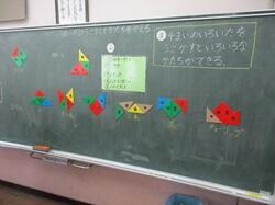 算数の授業風景です。学習単元は、「かたちづくり」です。最初は、手元にある4枚の色板を用いて、様々な形をつくりました。友達との交流の時間を設けて、それぞれの形を説明し合っていました。次に、4枚の色板の基本的か形をつくり、(スタートは四角形です)どのような形ができるのか、チャレンジタイムです。黒板には多くの図形ができました。子供たちの発想力の力は育っていますね。